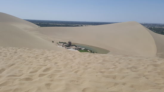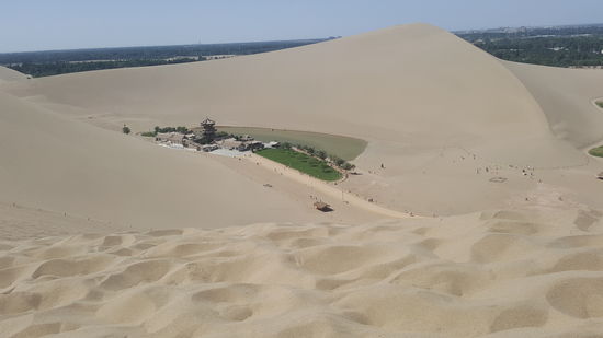 Die höchste Düne hier ist 1715m hoch—wegen der gewaltigen Dünen bekan Dunhuang den Beinamen : Sandstadt