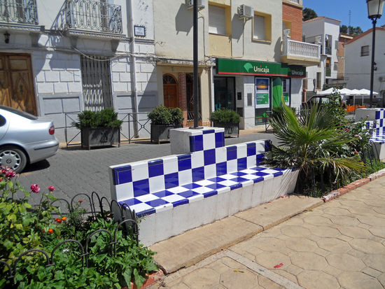 Die Plaza, die von blau-weiß gekachelten Bänken umgeben ist, wird von einem sehr schönen Brunnen dominiert. Das sieht herrlich aus. Direkt neben Kirche befindet sich das kleine Rathaus, natürlich schön beflaggt.