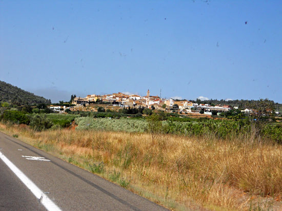 Ab Casas del Campillo A 35 Richtung Valencia. 13.45 Uhr sind wir in der Provinz Valencia. Hier ist die Straße sehr schlecht. 13.55 Uhr – Moixent – Bild. Überall an der Autobahn blüht rosa Oleander. Sieht wunderschön aus. Dahinter liegen Weinberge und Obstplantagen.