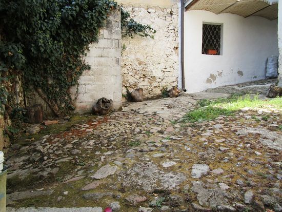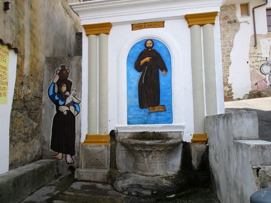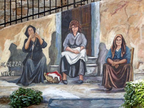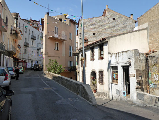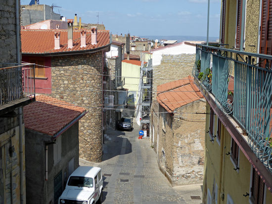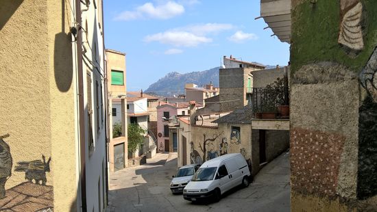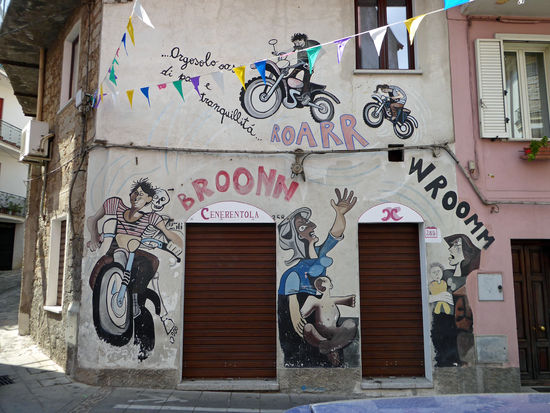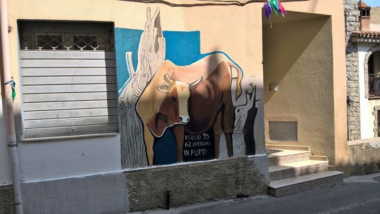 Der an einem Hang liegende Ort zeigt sich in vielerlei Hinsicht düster und unzugänglich. Holprige, schmale Gassen durchziehen den historischen Ortskern. An der Hauptstraße reiht sich eine Bar an die andere, davor sitzen Männer, von jung bis uralt, deshalb empfiehlt es sich für uns Frauen, etwas Bedeckendes zu tragen, wenn man die Murales, die berühmten Wandbilder, in Orgosolo anschauen will.