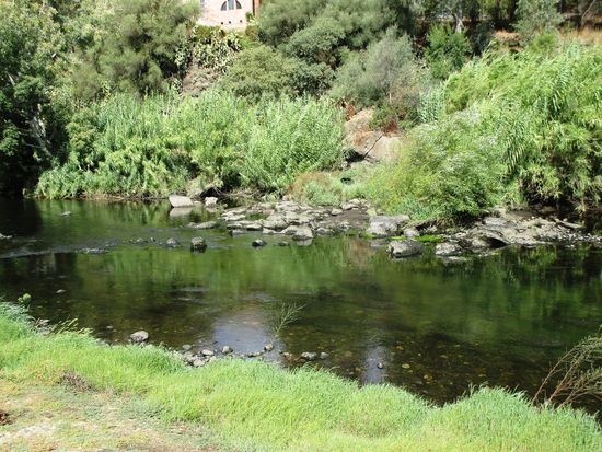 Einige Familien nutzen das warme Wetter und baden in dem nahe Rio Tirso. Doch oh Schreck, die dunklen Wolken verziehen sich nicht. Es fängt an zu regnen und zwar ziemlich kräftig. Rolf und ich flüchten uns unter ein Zelt einer geschlossenen Bar. Wir warten, bis es aufhört zu regnen. Gut, dass wir die Besichtigung noch ohne Regen machen konnten.