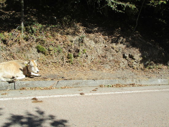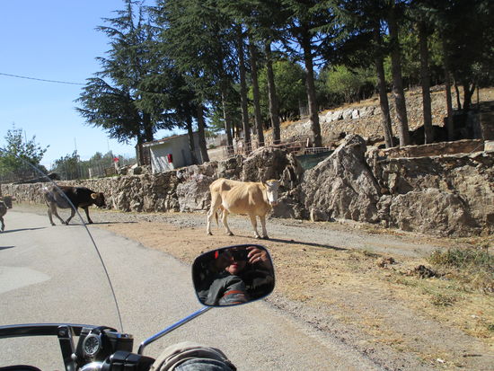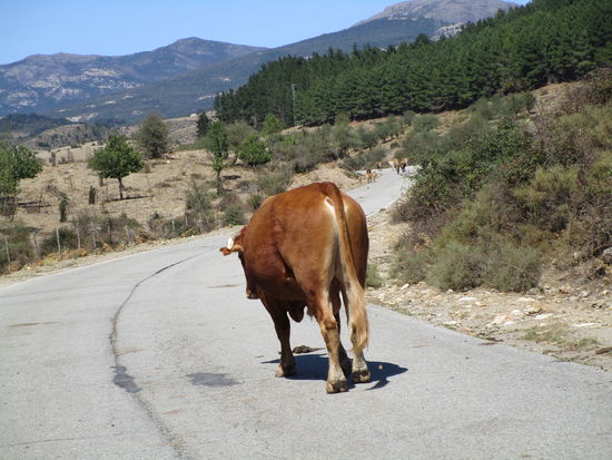 Auf dieser Strecke erleben wir einige merkwürdige Dinge. Eine große Rinderherde mit einem Bullen wandert mitten über die Straße. Rolf fährt langsam hinterher. Dann plötzlich machen sie alle einen Schwenk nach links und klettern hintereinander den Berg hoch. So etwas haben wir ja noch nie erlebt. Wie mir später ein Bauer erklärt, wissen die Rinder genau, wann und wie sie nach Hause kommen müssen. Ich bin platt.