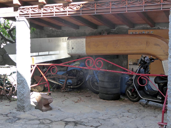 Man findet hier auch ein riesiges Taschenmesser, das auch im Guinnes Buch der Rekorde steht: Gewicht 295 kg, Länge 4,85 m. Die Klinge ist 22 mm dick und aus Edelstahl. Der Griff wurde aus Teak-holz gefertigt, von den Gebrüdern Gianni und Franco Lampis und Herrn Begliutti. Das ist das zweite Riesenmesser, das Paolo angefertigt hat. Das erste Messer ist auch im Museum ausgestellt.