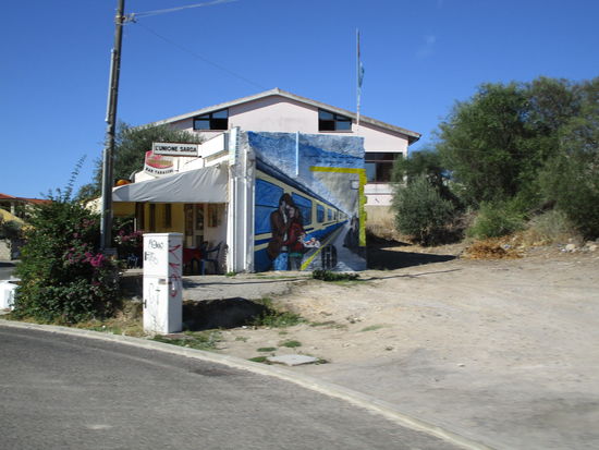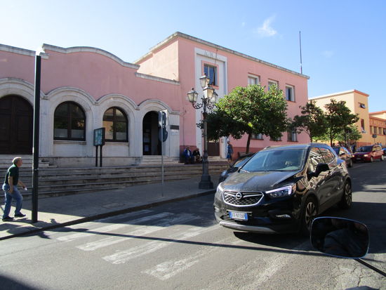 Nach vielen Bildern setze ich mich auf eine Bank vor dem Palazzo, während Rolf hinunter läuft, um dss Motorrad zu holen. Außerdem will er bei der Post eine Briefmarke für eine Postkarte an unsere Freunde, Familie Gerl, kaufen. Die Aktion dauert 25 Minuten. Rolf sagt später, nie mehr betritt er eine sardische Poststelle.