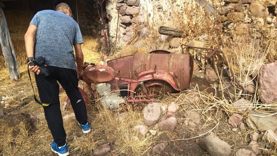 Bevor wir nach Villaperuccio fahren, halten wir noch an einem geschichtsträchtigen alten Bauernhof. Interessant, was es dort alles zu sehen gibt. Reste eines Motorrades, ein alter Traktor, den Rolf natürlich erklettern muss und sich dabei einen Riss in seiner Hose zuzieht. Na ja, kann man alles reparieren.