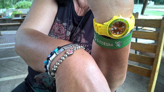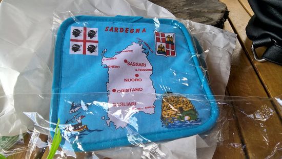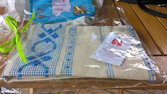 Ich erstehe noch einige Dinge für Zuhause: Topflappen, ein Magnet, eine Glocke, einen und zwei Armbänder. Andenken müssen sein. Für meine Freundin Sandra, die unser Haus hütet, kaufe ich ein Handtuch, sardische Handarbeit. Die Dame im Kiosk spendiert mir einen super guten Vernaccia, dieses Mal weil ich den Bewertungsbogen komplett ausgefüllt habe.