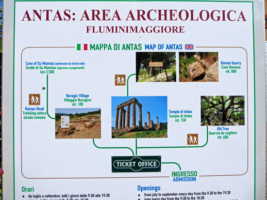 Antas-Tal - Dieses archaeologische interessante Gebiet ist von wesentlicher Wichtigkeit für Fluminimaggiore. Die Gegend, die schon zur Nuraghenzeit bewohnt war, weckte das Interesse der Karthager (Punier) und später der Römer wegen seiner Eisen und Bleilagern. Aus dieser Zeit 1200-900 v. Chr. bis 3. Jahrhundert n. Chr. sind beachtliche archäologische Ueberreste erhalten. Ein antiker Weg führt zur Grotte von Su Mannau, zu den Ruinen einer Siedlung aus der Nuraghen und Römerzeit und zu der imposanten Ruine des römisch-punischen Tempels, die dem Sardus pater Babai gewidmet war.