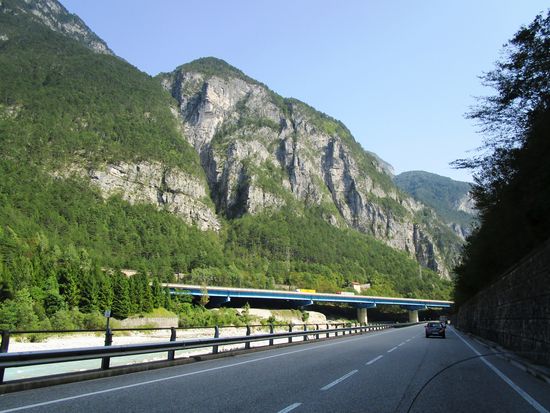 In Tarvisio machen wir um 14 Uhr Pause – Kaffee 1,10, Wein 1,40, Wasser 0,50, Brioche 1,20 Euro. Die Preise lassen wir uns gefallen. Wir kaufen noch schnell etwas ein, damit wir heute Abend picknicken können: 2 Flaschen alkoholfreies Bier, 1 Flasche Wein, Brot, Butter, Mortadella, Schinken.
