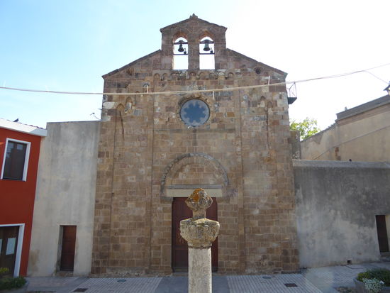 Die Chiesa Nostra Signora del Pilar wurde 1318 nach Plänen von Arrocco de Garnas errichtet und war zunächst San Ranieri geweiht. Die Kirche gilt als ein besonders schönes Beispiel der toskanischen Romanik auf Sardinien. Die Fassade ist aus Vulkangestein und zeigt eine Darstellung von Eva mit der Schlange. Über dem von feinen Lisenen umrahmten Portal ist eine Rosette. Bei einer Lisene handelt sich um eine schmale und leicht hervor tretende vertikale Verstärkung der Wand. Sie dient zur Gliederung, Betonung und Verzierung.