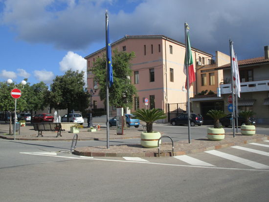 In Narcao vorbei am Rathaus. Wir halten an der Piazza Guglielmo Marconi. Rolf parkt vor dem Haushaltswarengeschäft Linea Casa di Moira Secchi.