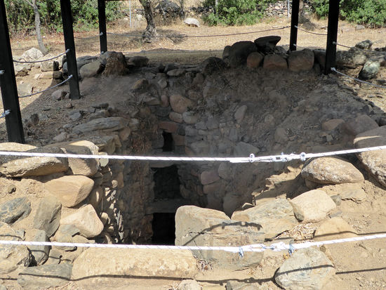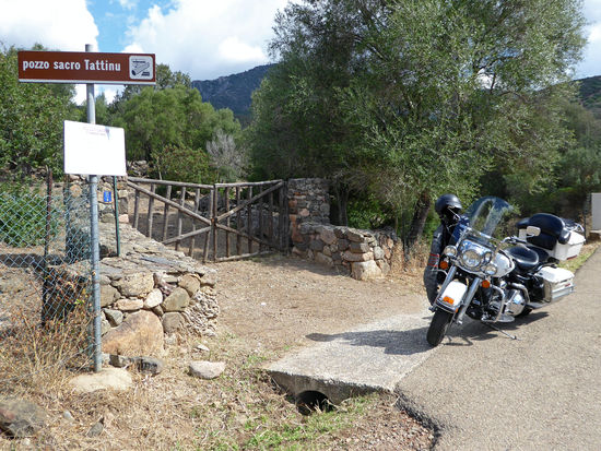 Doch an einer Gabelung sehen wir ein Schild, Pozzo Sacro di Tattinu, also fahren wir zunächst dorthin. Hier verbirgt sich in der Macchia, 20 m neben dem Feldweg, ein schönes, sich selbst überlassenes unterirdisches Brunnenheiligtum aus der Nuraghenzeit (11. Jh. v. Chr.). Der Zugang ist verriegelt, wohl wegen der vielen Viecher hier. Aber Rolf verschafft uns einen Zugang und so können wir zu dem Brunnenheiligtum laufen und dort Fotos machen. Stufen führen steil in die Tiefe. Allerdings ist dort eine Absperrung, wahrscheinlich weil der Zugang nicht sicher ist. Ausnahmsweise verzichtet sogar Rolf darauf, da herum zu kraxeln.