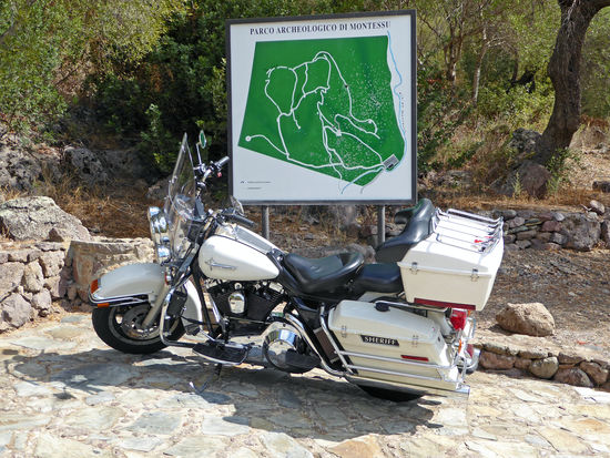 Der Eintritt zu der Necropole Domus de Janas von Montessu kostet 5 Euro/Person, was wir nicht als teuer empfinden, wenn man bedenkt, was es hier alles zu sehen und zu entdecken gibt. Kein Mensch ist heute Morgen hier zu sehen. Wir sind die ersten Besucher. Ein freundlicher älterer Herr gibt uns eine deutsche Info, die wir aber zurück geben müssen. Dann erklärt er uns den Weg zu einem Parkplatz, wo wir das Motorrad abstellen und dann zu Fuß weiter wandern können.