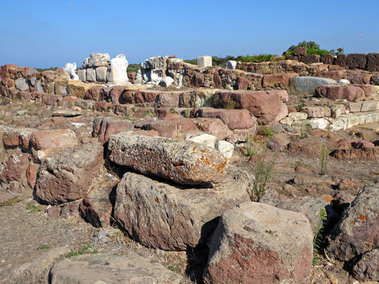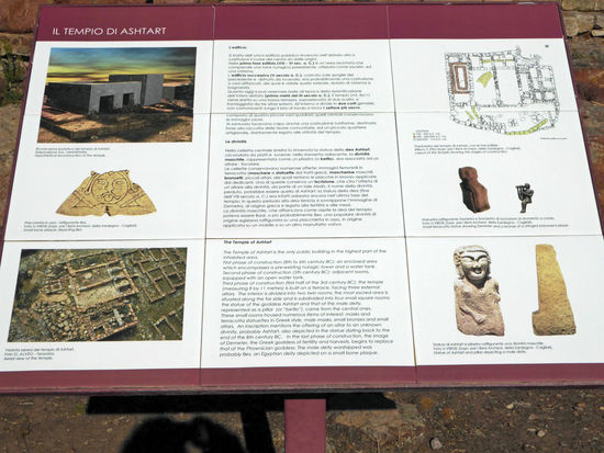 Akropolis. Der Hauptturm der nur kurzzeitig kompletten Akropolis, wurde in einen zweigeteilten punischen Tempel umgebaut. In einem Raum fanden die Opfer statt, im anderen fand man die Steinplastik einer Göttin. Es handelt sich bei dem rudimentären Torso um eine Darstellung der Astarte. Betont sind Augenbrauen, Lippen, Nase, die übergroßen Ohren und das in strenge Locken gelegte Haar. Ähnliche Darstellungen kennt man von Reliefs des 7. Jh. v. Chr. aus dem Vorderen Orient. Eine männliche