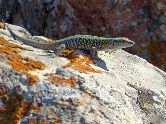 Bei unserem Rundgang begegnen uns einige Schlangen, die sich auf den Wegen sonnen. Es sind Gelb-Grüne Zornnattern, wie mir eine ältere Dame namens Teresa verrät. Auch einige Echsen genießen die Wärme des heutigen Tages.