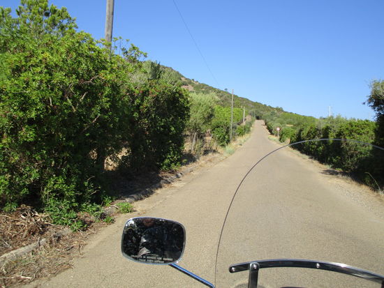Von Maladroxia steigt die Straße – Strada Comunale Coaquaddus - steil an und klettert kurvig hinauf zum Sarazenenturm Torre Canai.