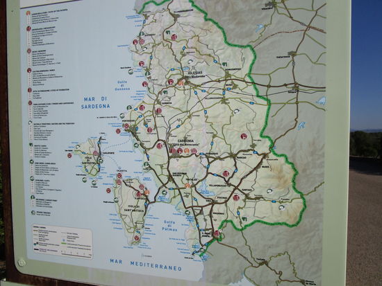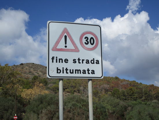 Weiter Richtung Capo Sperone. Leider ist an einem Kreisverkehr mal wieder nicht zu erkennen, wie man fahren muss. Schon bald endet die asphaltierte Straße und man kommt zu einer katastrophalen Holperpiste. Einige Autofahrer drehen wie wir um. Das muss man sich nicht antun.