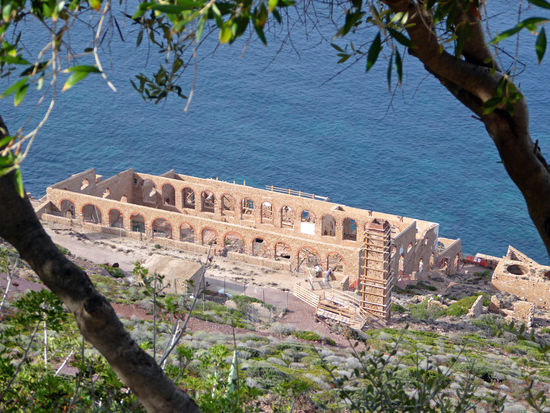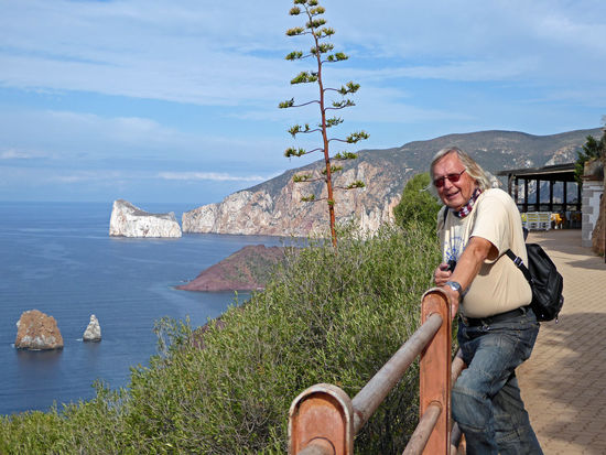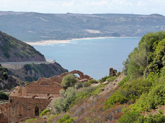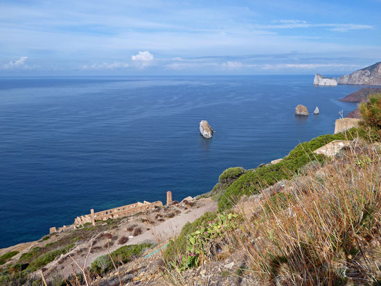 Schräg gegenüber hängt der alte Zechenhafen Porto Flavia zwischen Himmel und Meer an einer senkrechten Wand. Hier wurden ab 1924 die Schiffe mit den Erzen aus den Bergwerken der Umgebung beladen.