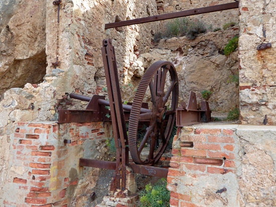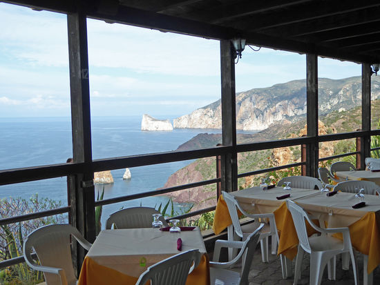 Das Restaurant Al’906 Operaio hat sich einen tollen Platz ausgesucht, von jedem Tisch aus sieht man den Pan di Zucchero. Die Bar, die Küche etc. sind im Felsen untergebracht, in einem alten Sprengstofflager einer Mine. Die Toiletten befinden sich im alten Zündermagazin. Vor der Grottenbar spannt sich eine Panorama-Terrasse auf, die für uns zum Schönsten gehört, was Sardinien zu bieten hat. Leider hat die Bar noch geschlossen und so wandern wir weiter und gelangen zurück ins Dorf.
