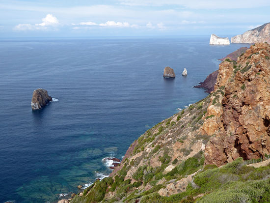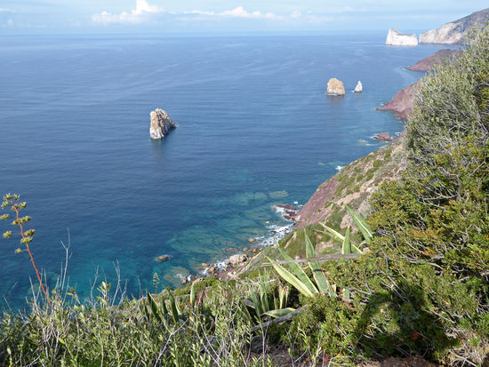 Wir erkennen einen Wanderweg entlang der Küste, auf der einen Seite die Felsen, auf der anderen Seite das Meer. Il sentiero dei cinque faraglioni heißt dieser Weg – Weg der 5 Klippen/Felsen. Gemeint sind die fünf markanten Felsen im Golfo di Gonnesa – Golfo di Leone.