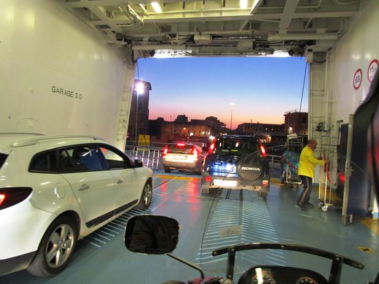 Wir müssen warten, bis die riesigen LKWs, die unser Motorrad eingeschlossen haben, die Fähre verlassen haben. Ein riesiger Ölfleck, gefährlich für alle Motorradfahrer, wird sofort von dem Personal der Fähre entfernt. Auch dafür ein dickes Lob.
