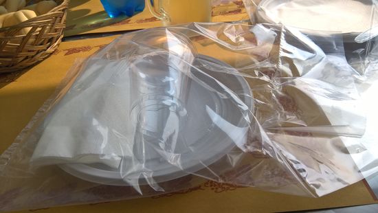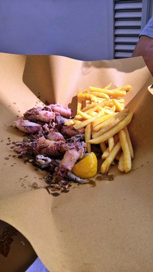 Allerdings bekommt man dort Plastikgeschirr, grauenvoll. Aber das Essen sehr lecker: Frittura Calamari/Sardinen = 8 Euro, ½ Portion Pommes = 3 Euro, ½ l Wein = 5 Euro, 1 l Wasser = 1,50 Euro, Coperta = 3 Euro, zusammen 20 Euro. Wir sind zufrieden.