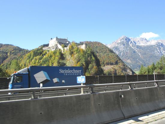 Wir sehen die Festung Hohenwerfen, inmitten der nördlichen Kalkalpen. Die Festung thront, gut sichtbar, am nördlichen Ende des Marktes Werfen auf einem sich 113 m über die Salzach erhebenden Felskegel, dem Werfener Burgberg (697 m). Er bildet mit dem Gesengköpfl (885 m) einen natürlichen Pass zwischen Gesengköpfl und Zetzenbergkogel (740 m). Der Pass ist der einzige Zugang zum Pass Lueg und so eine strategische Schlüsselstelle auf der uralten Alpentransversale, die Salzburg mit Graz und Südosteuropa ebenso verbindet wie mit Venedig und ganz Italien.
