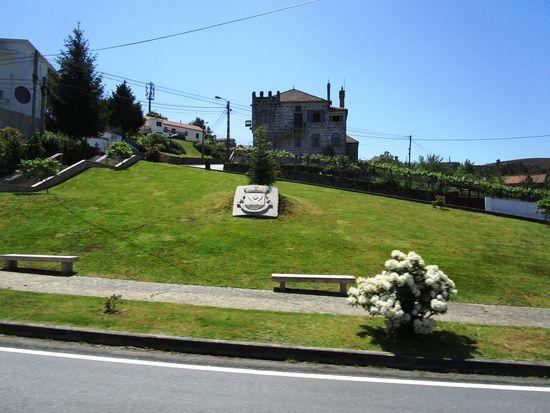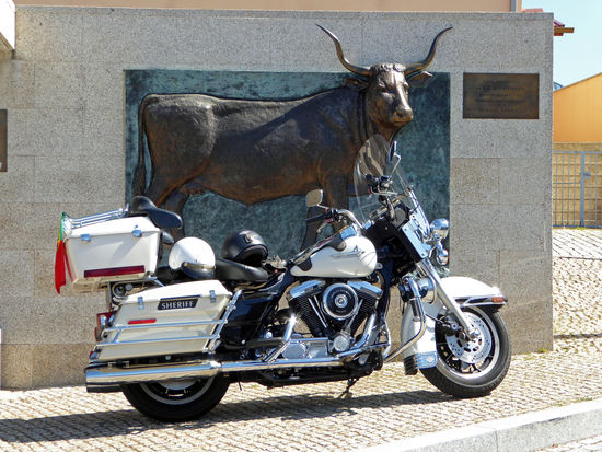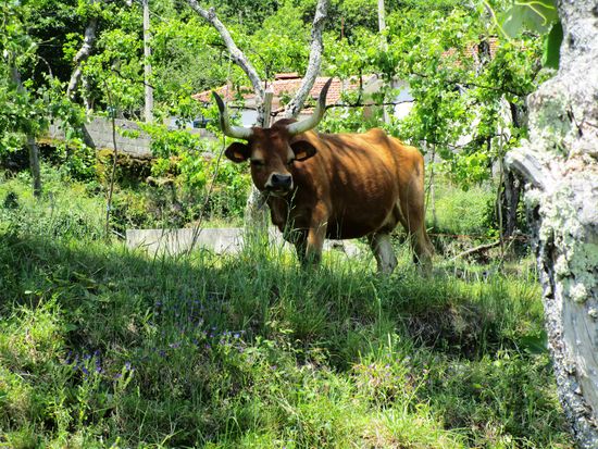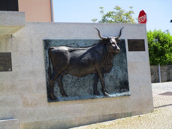 Wir halten am Denkmal Terra do Barrosao, welches ein Barrosao-Rind darstellt.
