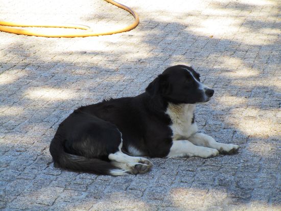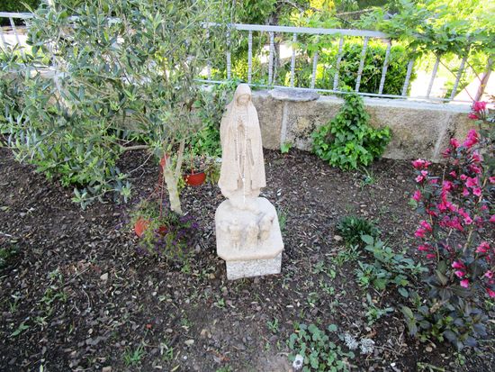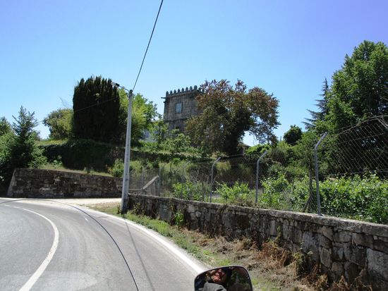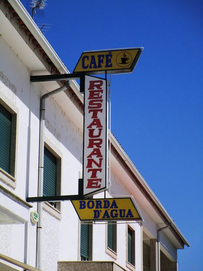Dann geht es zur Cafe Bord D’agua, Weißwein, Wasser, Tonic, 2,20 Euro. Ein Hund leistet uns Gesellschaft. In dem kleinen Garten, der das Haus begrenzt, steht eine Marienstatue. Es ist für mich unerträglich heiß. Rolf hat in diesem Haus auf seiner Pilgerwanderung gewohnt. Sie haben mittlerweile eine schöne Terrasse angebaut, mit herrlichem Blick auf den Fluss. Dann gibt es eine neue supermoderne Toilette für Männer. Die Frauentoilette muss man erst einmal suchen, scheint nicht so wichtig zu sein.