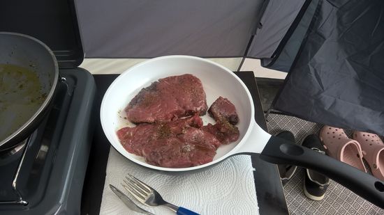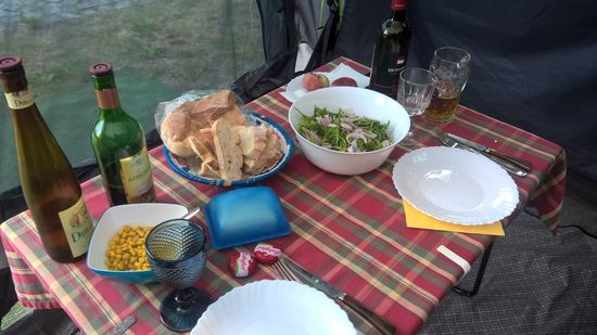 Zum Abendessen haben wir Barroso-Steak, herrliches Fleisch, dazu Salat, Brot, Wein. Lecker.