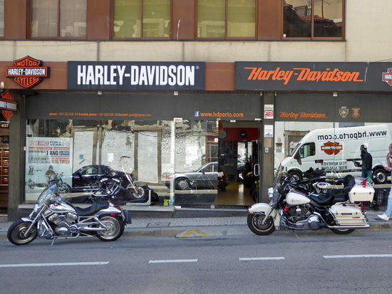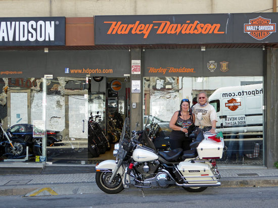 Gegen 14.30 Uhr verlassen wir Helga, fahren nach Porto ins Zentrum. Dort suchen wir den Harley-Dealer. Es dauert ewig, bis wir den gefunden haben. Wir fragen ein paar Mal und dann endlich sind wir da. Rolf bespricht mit dem Sales Manager, den Grund unseres Besuches – Es wird eine Geschichte für das HOG Magazin geben. Dafür wollen wir hier ein paar Fotos machen. Leider finde ich in dem kleinen Geschäft kein vernünftiges T-Shirt.