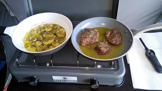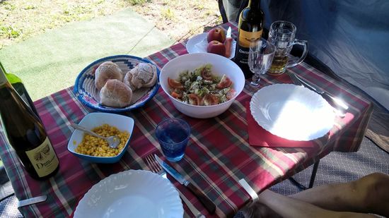 Zum Abendessen gibt es Steaks, Salat, Maissalat, Nektarinen, Brot und Wein.