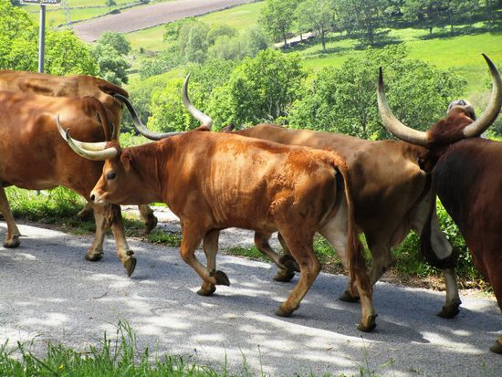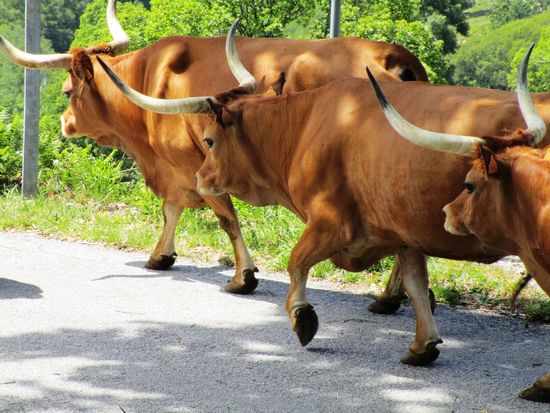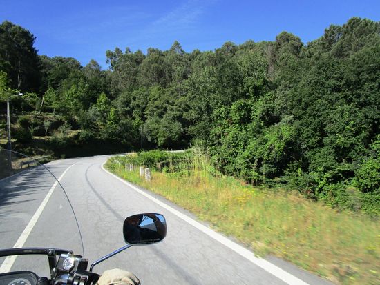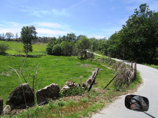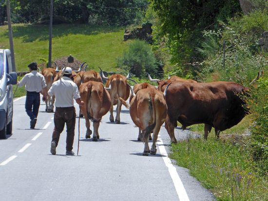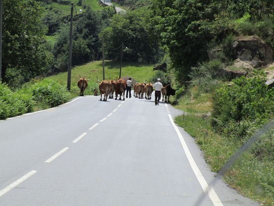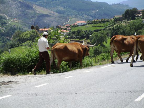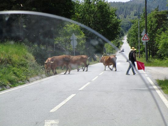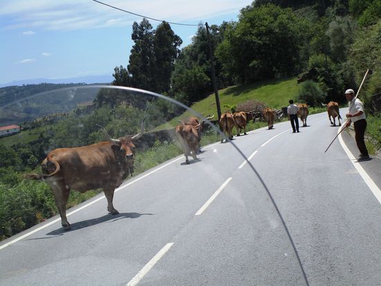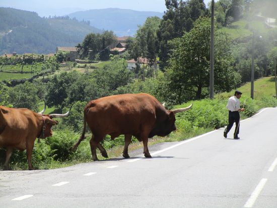 Es geht weiter, durch die Serra do Barroso. Einige Barrosa-Rinder sind auf der Straße unterwegs. Mir ist doch immer etwas mulmig, wenn ich sie so nah an unserem Motorrad sehe. Rolf amüsiert das, wenn ich Angst habe.