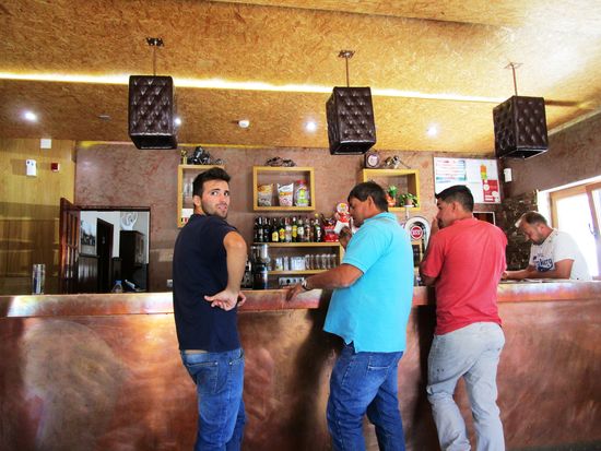 Wir sitzen draußen und ich gehe rein, um zu bestellen. Aber die junge Frau, die bedient, ist nicht gerade die Klügste. Bestelle ein Glas Weißwein (1,00) und ein Tonic. Als sie es uns bringt, merkt Rolf sofort, da ist ganz schön viel Alkohol drin in seinem Tonic. Ich bringe das Glas zurück, sie wusste nicht, dass Tonic Tonic ist. Einer der jungen Männer an der Bar erbarmt sich und trinkt den Gin Tonic. Rolf bekommt dann ein richtiges Tonic (1,20), dazu eine Suppe (2,80). Später teilen wir uns ein Schinkenomelett mit Kartoffeln (7,00). Sehr lecker.