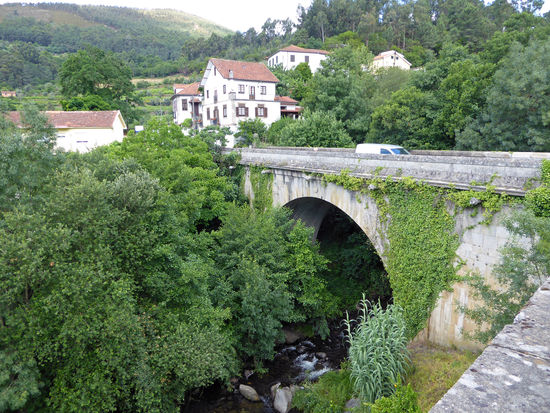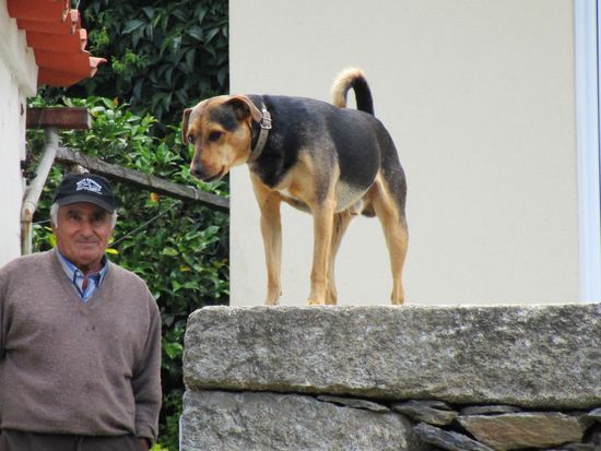 Vor Mesao da Frio kommen wir erneut über die alte Brücke von 1843 über den Rio Teixeira, für die LKWs ist die Kurve nach der Brücke ganz schön eng. Wir halten und machen einige Bilder, beobachtet von einem freundlichen alten Herrn und seinem Hund.