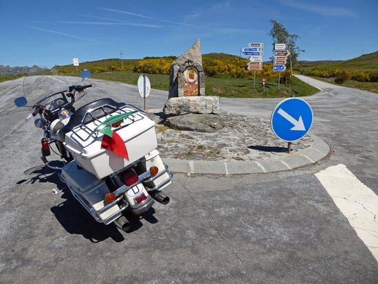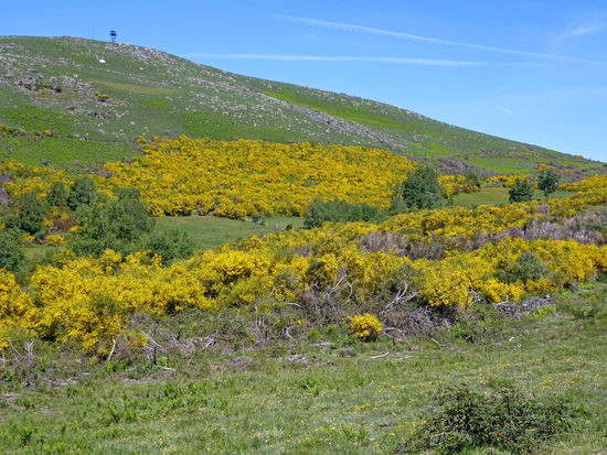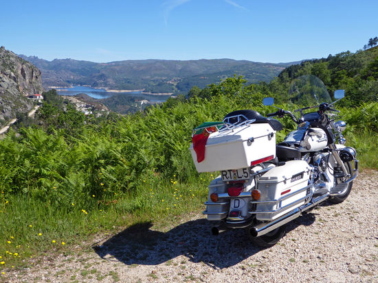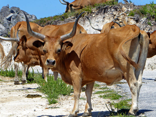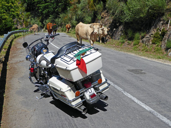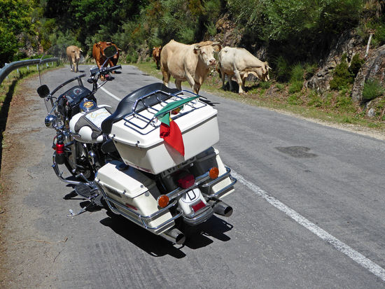 Schon bald ist der Parque Nacional da Peneda-Geres erreicht, eine herrliche einsame Berglandschaft. Überall blüht gelber Ginster. Hier begegnen Rolf einige Rinder auf der Straße. Während er fotografiert, schauen sie neugierig das geparkte Motorrad an.