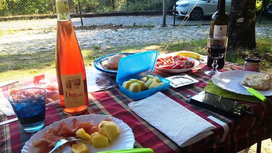 Zum Abendessen gibt es Schinken, Ananas, Tomatensalat, Brot und Wein. Viel essen wir nicht, es ist einfach zu warm.