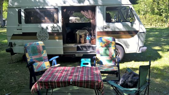 Links von uns sind nette Nachbarn, rechts die Nachbarn sind wohl unterwegs. Daneben blöde Camper, erwidern nicht mal den Gruß. Und dann kommt ein kleiner Spitz, will erst mal an unsere Stühle pinkeln. Ich verscheuche ihn. Beim nächsten Mal kommt meine Wasserpistole zum Einsatz.