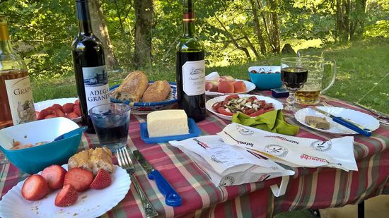 Zum Abendessen gibt es Pate, Comte-Käse, Tomatensalat, endlich wieder super Baguette, Kirschen, Aprikosen, Pfirsiche, Krabben, Erdbeeren, dazu Wein.