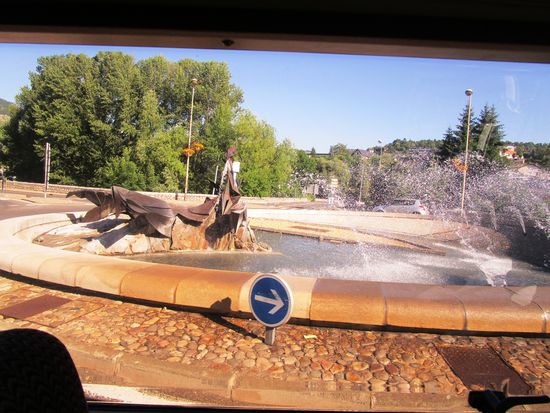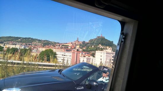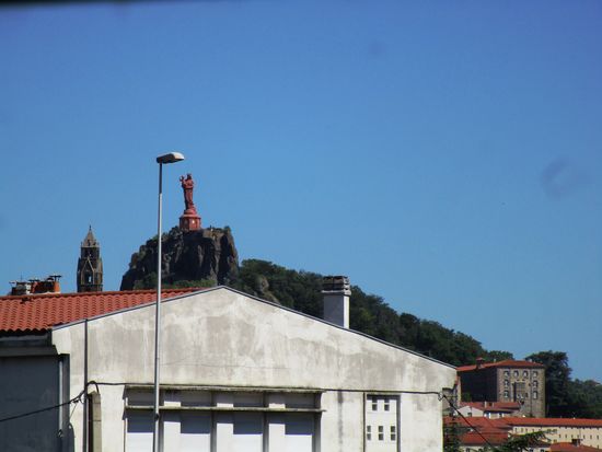 11 Uhr - Schon bald ist in Le Puy en Velay die riesige Marienstatue Notre Dame de la France, die 1860 dank einer Staatsanleihe gegossen werden konnte, gut zu sehen. Auf diese Weise konnten 213 von Napoleon III. gestiftete eiserne Kanonen aus der Einnahme von Sebastopol friedlicheren Zwecken zugeführt werden. Innen führt eine Treppe bis in den Hals der Madonna, die heute rosa angemalt ist. Nachts wird sie angestrahlt und gibt dabei ein besonders „liebliches“ Bild. Die Statue ist 16 m, mit Sockel 22 m hoch und 110 t, mit Sockel 835t schwer. Sie steht auf dem Vulkankegel, dem Rocher Corneille. Sie wurde 1860 vor über 120.000 Pilgern eingeweiht.