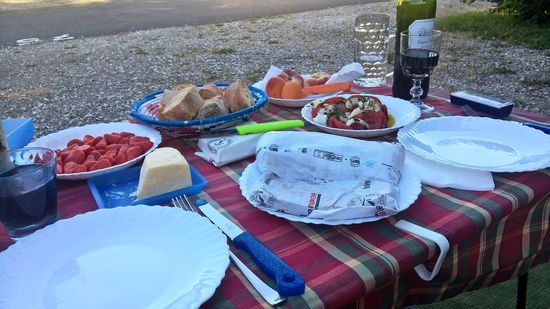 Abendessen Pate, Lachs, Erdbeeren, Pfirsiche, Aprikosen, Baguette, Wein. Morgen geht es nun endgültig nach Hause.
