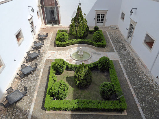 Die Besichtigung geht weiter. Das Hotel hat einen sehr schönen Innenhof mit Brunnen. Von dort geht es über eine steile Treppe auf den Torre das Tres Coroas. Mir ist das zu anstrengend, die vielen Stufen herauf zu kraxeln. Aber Rolf macht sich natürlich auf den Weg. Er winkt mir von oben zu.