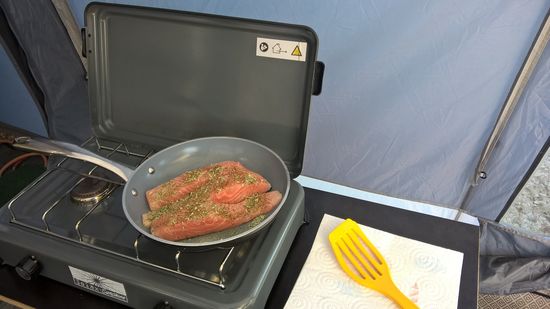 Zum Abendessen haben wir Lachs, grünen Spargel, Ananas, Äpfel, Brot und Wein. Später schauen wir uns noch einen alten Film an.