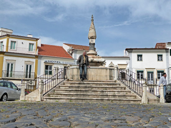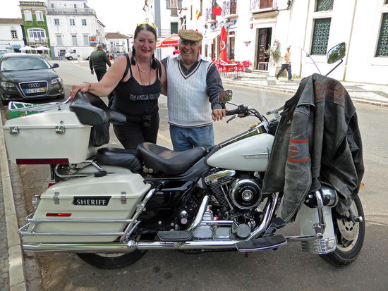 An unserem Parkplatz treffen wir auf einige ältere Portugiesen, die die Harley bewundern. Einer der Männer spricht uns in perfektem Deutsch an. Er arbeitete früher als Dolmetscher bei der DB in Münster. Sein Rentnerdasein verbringt er in der Heimat in Estremoz. Allerdings erzählt er uns, dass er jedes Jahr für einen Gesundheitscheck nach Deutschland fährt. Interessant, was man so alles erfährt. Natürlich wird auch ein Erinnerungsfoto gemacht.