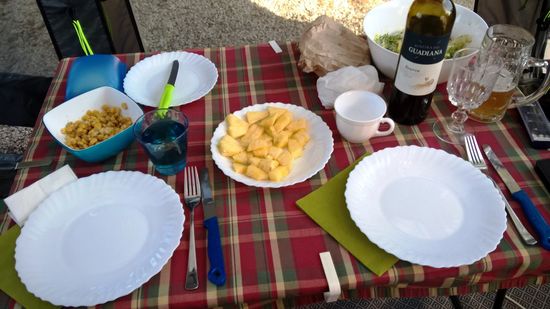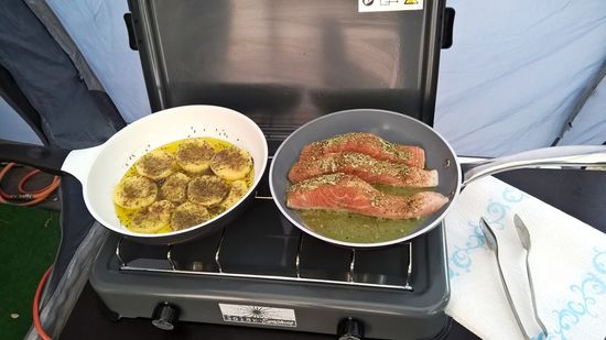 Zum Abendessen gibt es Lachs, Kartoffeln, Ananas, Brot, Salat und Wein. Es war wieder ein sehr schöner Tag.