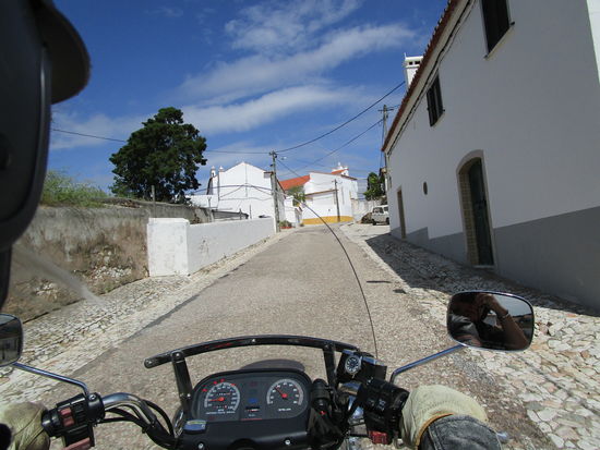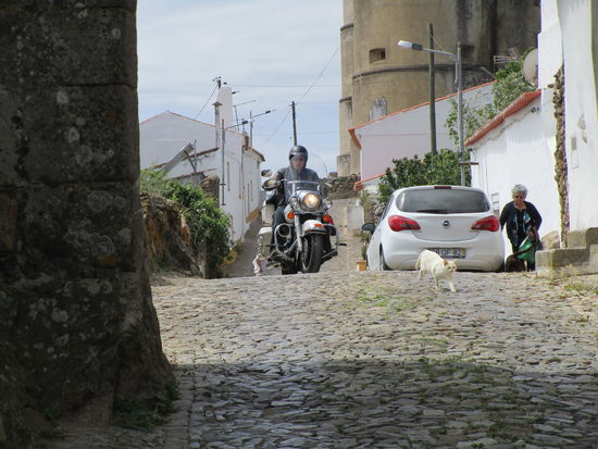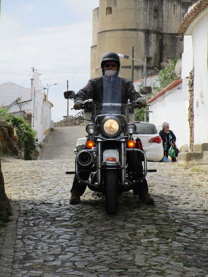 Nach dem Frühstück geht es zunächst nach Estremoz auf den Markt, zum Einkauf. Obst, Gemüse, Eier, Brot – alles sehr günstig und direkt von den Bauern. Während Rolf noch Butter im Supermarkt einkauf, warte ich am Motorrad. Ein Mann, der neben uns geparkt hat, kommt vom Einkauf zurück, begrüsst mich mit Handschlag und erzählt, dass er auch eine Harley fahre, eine Softail. Er spricht perfektes Deutsch, so können wir uns eine Weile unterhalten, bis Rolf zurück kommt.
