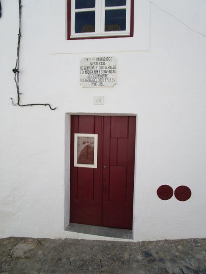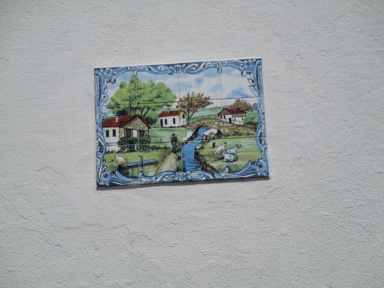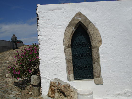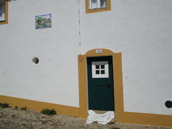 Dann machen wir uns auf den Weg ins nahe Evora Monte. Dort geht es steil hinauf zum Castelo. Interessante schöne kleine Häuser. Manche haben bunte Wandgemälde. Merkwürdig ist, was man vor den Haustüren sieht … Bretter oder Lumpen. Rolf erklärt mir, dass sei zum Schutz vor dem Regenwasser, damit es nicht ins Haus eindringt. Na ja, mal wieder interessant.