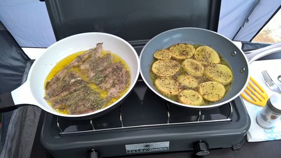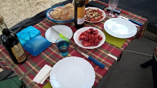 Zum Abendessen haben wir Sardinen, Kartoffeln, Tomatensalat, Erdbeeren, Brot und Wein.