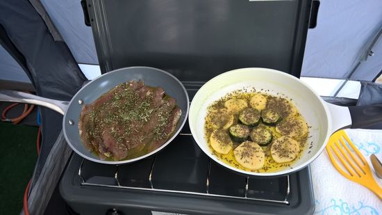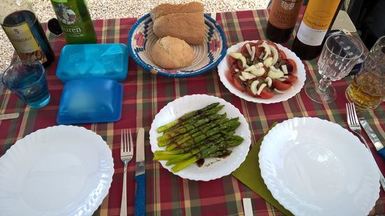 Wir lesen und relaxen. Zum Abendessen gibt es Sardinen, Spargel, Salat, Ananas, Brot, Käse, Wein.