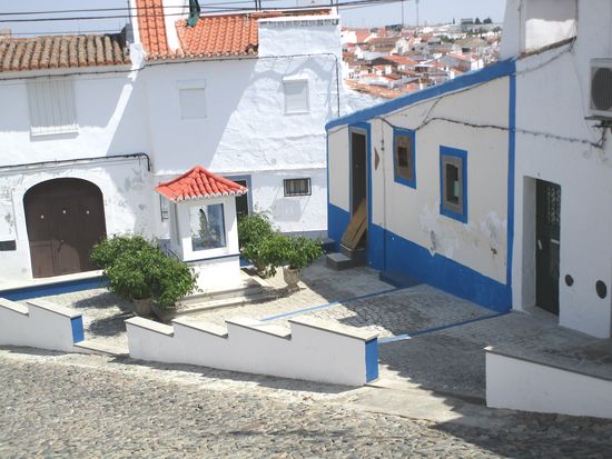 Vorbei am kleinen Stadtpark – hier steht eine Statue der Hl. Beatriz da Silva, der Schutzpatronin des Ortes - geht es hoch hinauf zum Castelo, vorbei an schönen alten Häusern, mit prächtigen Adels-Wappen, Blumen, interessanten Türen und Fenstern. Auch hier sieht man öfter bunte Heiligenbilder über den Eingangsportalen. Ein Kindergarten hat sein Gebäude mit einem Gemälde verschönert. Es gibt immer so viel zu sehen und zu bestaunen. Ein Elektriker würde wohl in Ohnmacht fallen, wenn er die Leitungen hier sehen könnte. Wahnsinn.