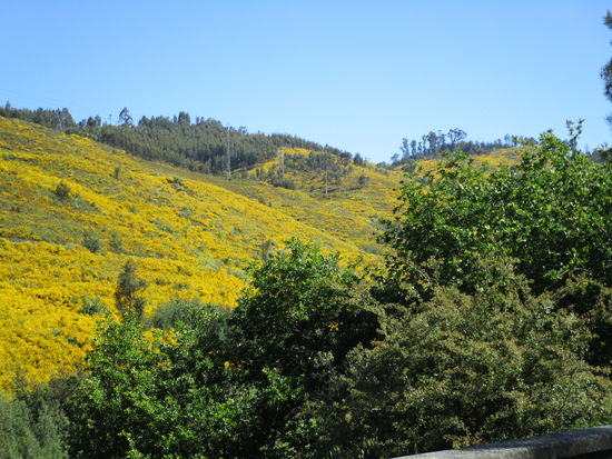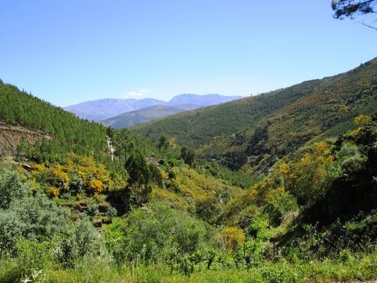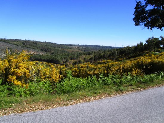 Route: N 342 Secarias, Coja. Überall viel Eukalyptus und gelber blühender Ginster zu sehen. Riecht nicht besonders gut. Aber eine herrliche Berglandschaft, kaum Verkehr auf den Straßen.